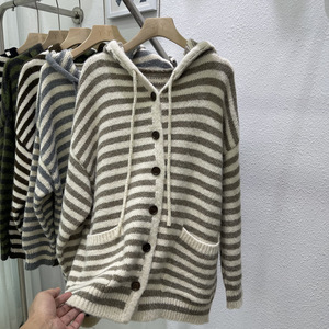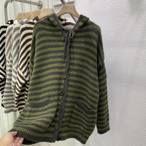 撞色条纹连帽针织开衫女秋冬季2025新款宽松慵懒风设计感毛衣外套