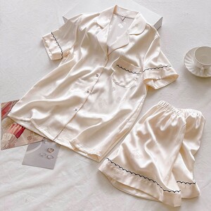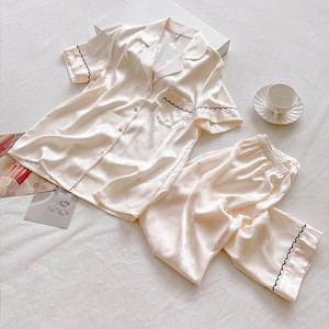 【桑蚕丝】夏季真丝睡衣女CHUN色提花薄款家居短袖短裤长裤套装