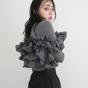 外贸跨境日系女装拼接荷叶边长袖棉T恤女秋时尚减龄显瘦透气上衣
