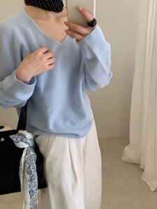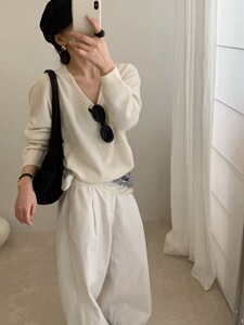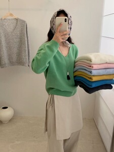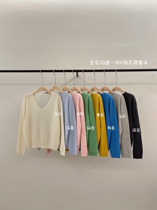 100%全羊毛无缝一体韩系V领甜美简约显瘦宽松纯色毛衣打底针织衫