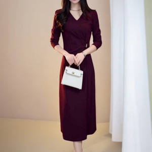 MLD-01 秋季新款樱桃红色V领收腰系带优雅时尚气质显瘦连衣裙