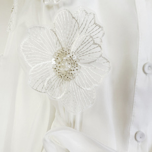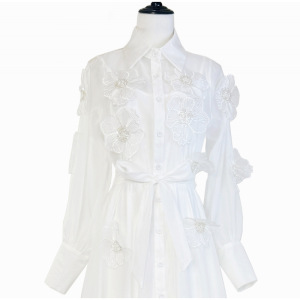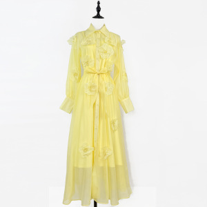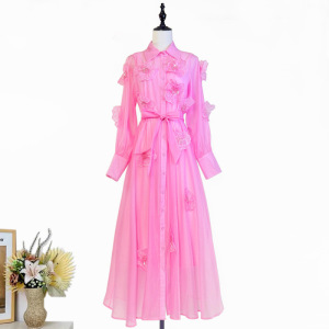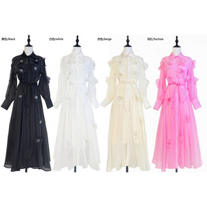 法式翻领钉珠刺绣贴花连衣裙气质长袖收腰系带连衣裙长裙