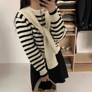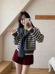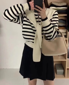 秋季新款韩版气质条纹短款针织开衫女小众设计感宽松百搭长袖外套