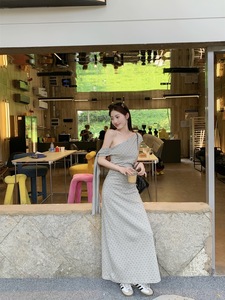 纯欲高级灰斜肩短袖波点连衣裙2025夏季新款收腰显瘦A字长裙女ins
