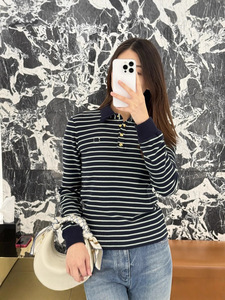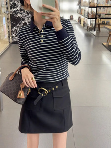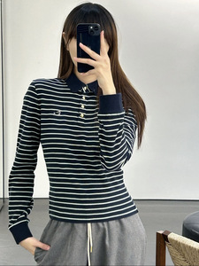 早秋新款polo领撞色条纹针织衫女法式洋气显瘦百搭气质简约上衣潮