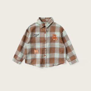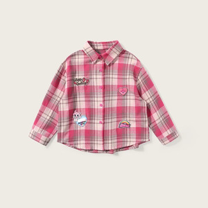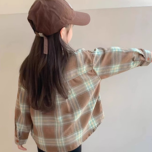 女童春秋卡通衬衣上衣中大童春秋新款拼色单排扣格子衬衫春装外套
