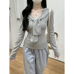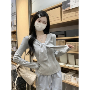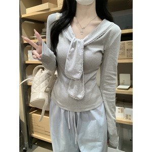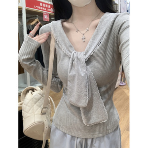秋季韩版纯欲海军领撞色条纹设计感减龄棉长袖T恤女上衣