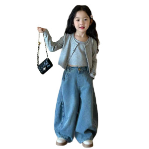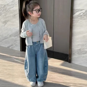 女童纯色工字短款背心纯色圆领开衫2025春季新款童装韩版牛仔裤子
