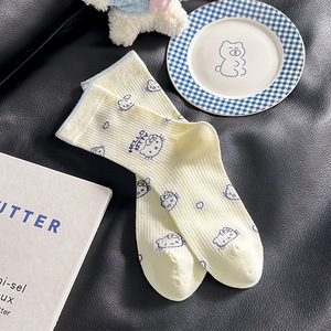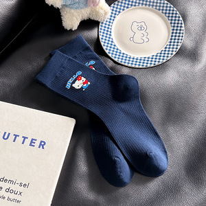 秋冬新款女中筒袜卡通堆堆袜可爱日系长筒袜子少女蓝白色KT猫袜子