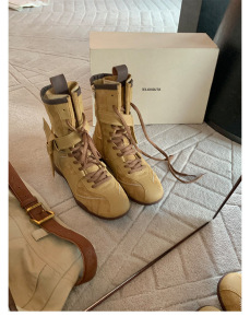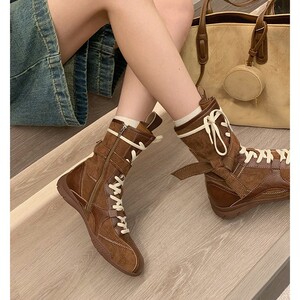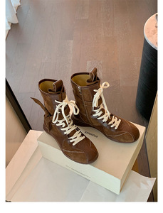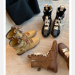 牛皮~ins时髦复古拼色拳击靴百搭绑带侧拉链猎装德训马丁靴女秋冬