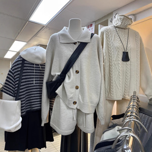 十三行春夏文艺淑女针织翻领单排扣开衫外套+抽绳针织短裤套装女