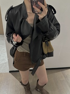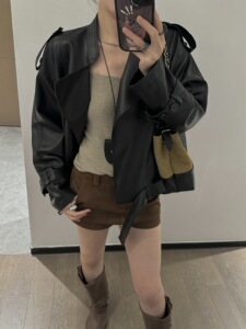 高级感欧美时尚杂志风经典翻领机车皮衣女2025秋季新款宽松PU夹克
