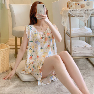 人造棉睡衣女春夏季棉绸印花家居服甜美可爱可外穿格纹无袖套装