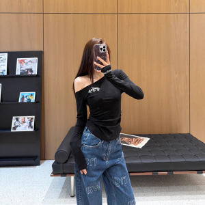 ch烫钻斜肩上衣露肩重工前后烫钻十字架辣妹修身显瘦打底长袖T恤