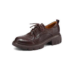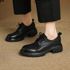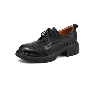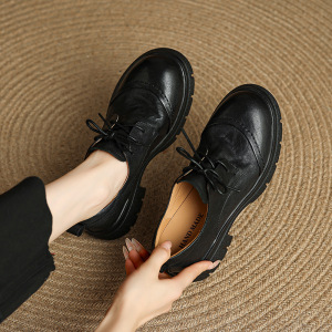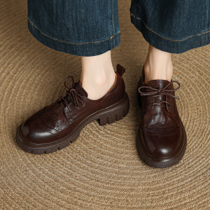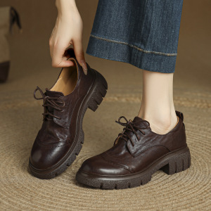 久站不累工作鞋头层牛皮2025厚底粗中跟系带小皮鞋圆头真皮单鞋女