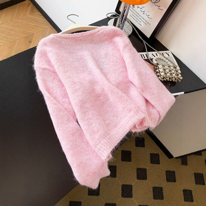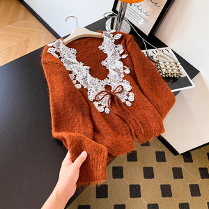 实拍法式浪漫蕾丝刺绣拼接马海毛奶茶杏色针织开衫秋