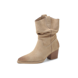 2025早秋新款复古百搭尖头粗跟短靴女靴撞色磨砂高跟堆堆靴马丁靴