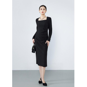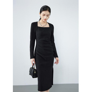 设计感方领长袖包臀连衣裙女2025夏季新款赫本高级感开叉小黑裙子