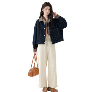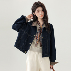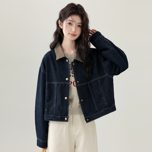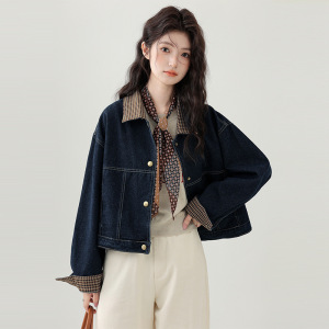 春秋新款港风翻领格子拼接牛仔短外套女小个子夹克上衣