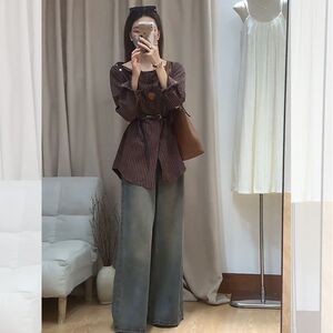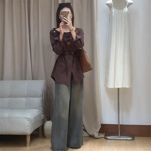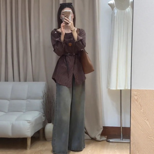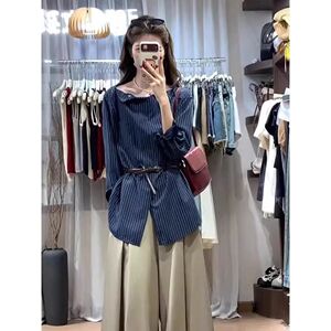 初春韩系穿搭一字肩条纹不规则长袖衬衫女春秋外搭设计感小众衬衣