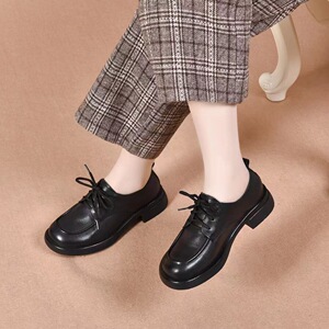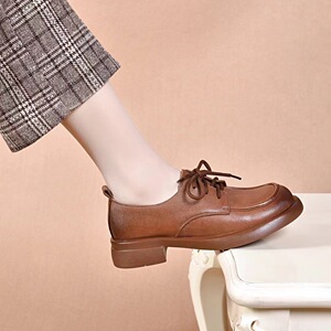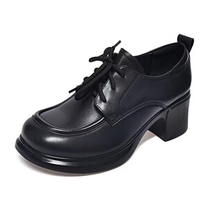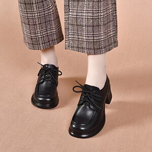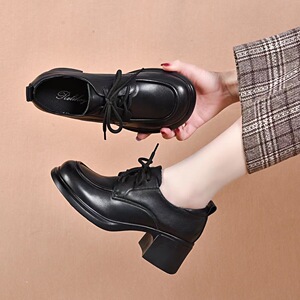 真皮乐福鞋女2025新款春秋粗跟深口系带头层牛皮松糕底百搭小皮鞋