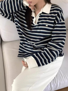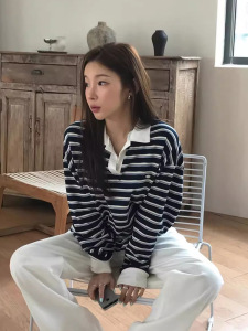 韩国chic秋季新款甜美减龄Polo领撞色宽松百搭休闲长袖条纹T恤女