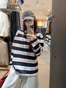 miu系美学 复古慵懒条纹圆领长袖t恤女秋宽松上衣休闲百搭