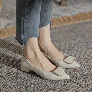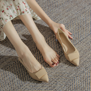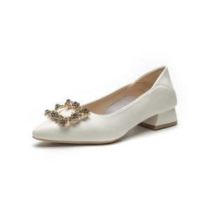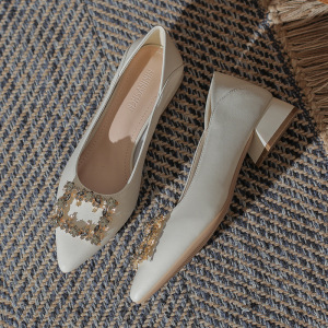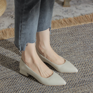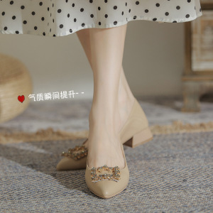 真皮粗跟单鞋女鞋2025新款春秋低跟尖头浅口法式软皮水钻中跟瓢鞋