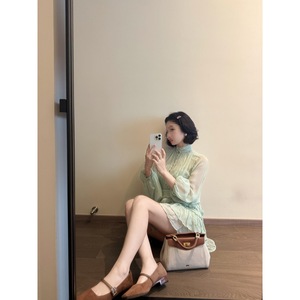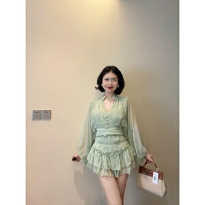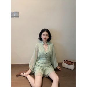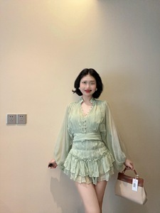 法式绿色荷叶边雪纺连衣裙女夏季设计感小众腰显瘦绝美漂亮裙子