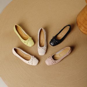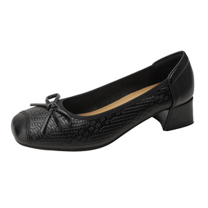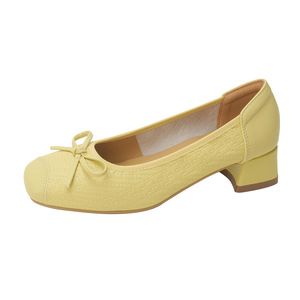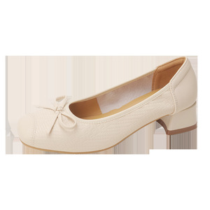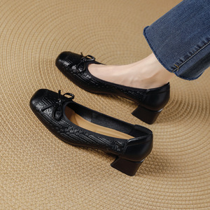 2025春秋新款休闲透气方头中跟粗跟单鞋女浅口百搭蝴蝶结小皮鞋