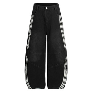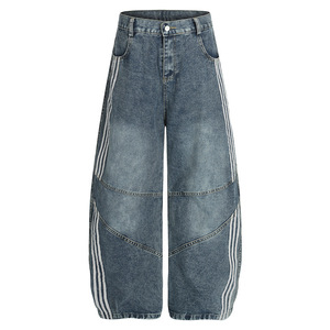广州衣品美式复古条纹三条杠水洗做旧牛仔裤慵懒风宽松弯刀阔腿裤