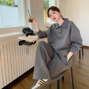 灰色运动休闲条纹拼接卫衣套装女2025秋季新款设计感阔腿裤两件套