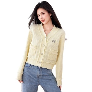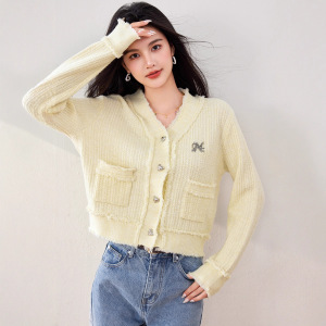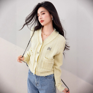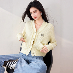 毛衣女款外套2025新款早秋季慵懒风黄色V领针织开衫宽松长袖上衣