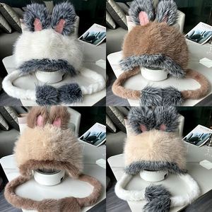 仿狐狸毛兔子耳朵毛绒挂球帽子秋冬款大头围加厚保暖帽加绒护耳帽