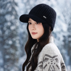 帽子女金属标加绒加厚兔毛针织鸭舌帽秋冬户外时尚百搭防风保暖帽