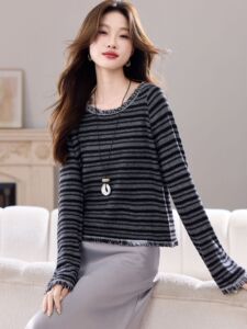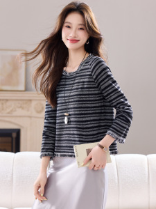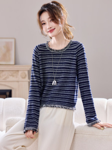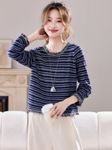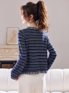 韩版复古撞色条纹流苏针织衫女2025秋季新款圆领长袖减龄宽松上衣