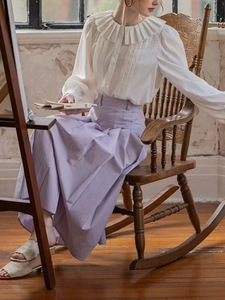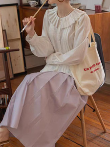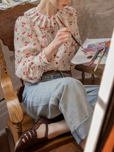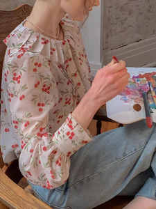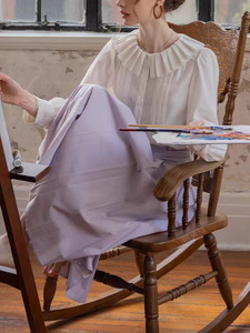 法式慵懒拉夫领对丝压绉领工艺轻盈感灯笼袖衬衫上衣