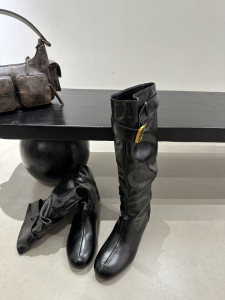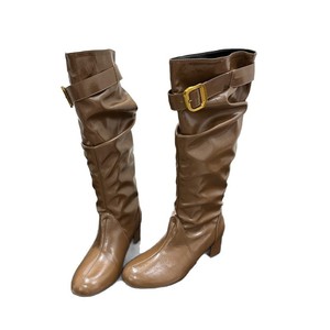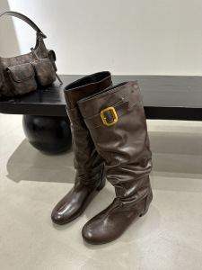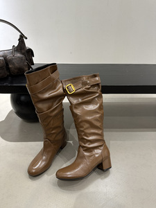 2025年秋冬新款复古圆头粗跟中跟靴女皮带扣褶皱堆堆靴高跟长靴