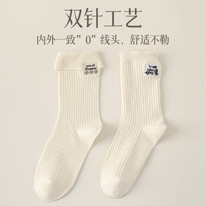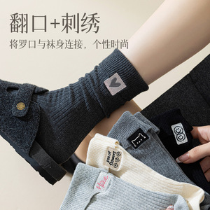 翻口刺绣女袜双针中筒袜竖条纹春秋季时尚ins潮百搭袜子女学院风