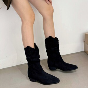 堆堆靴复古绒面粗跟中跟短筒靴女2025年秋冬新款方小头褶皱马丁靴