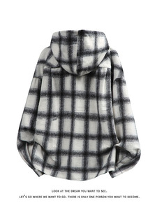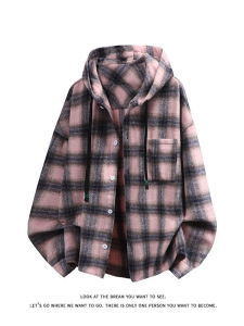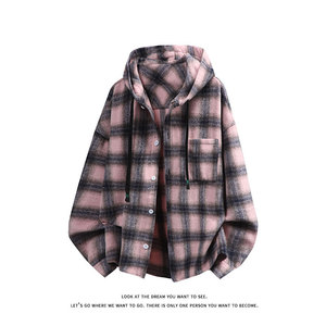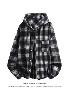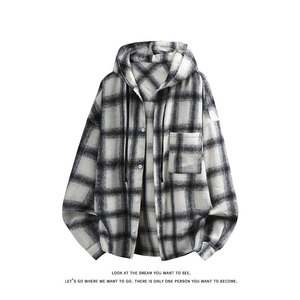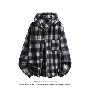 磨毛加厚连帽外套男2025秋冬新款美式慵懒风宽松休闲格子长袖衬衫