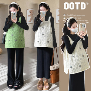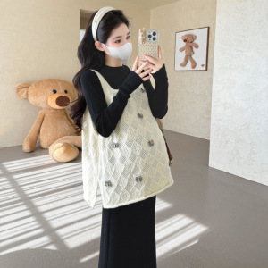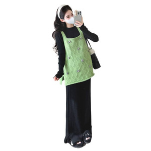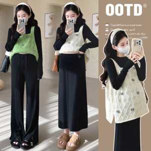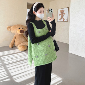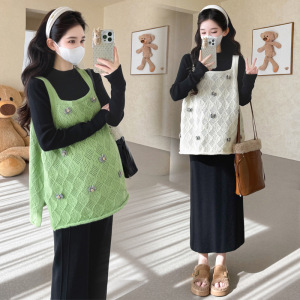 孕妇秋冬新款吊带马甲毛衣半领打底针织裤时尚半裙甜美显瘦三件套