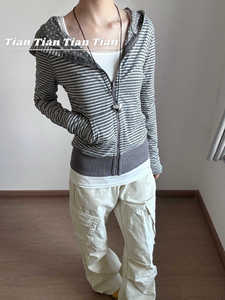 2025早秋新款复古修身显瘦辣妹条纹斑点薄款连帽开衫卫衣女ins潮