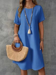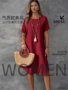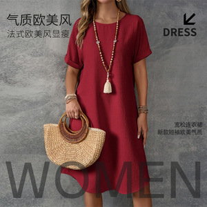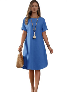 休闲宽松连衣裙复古办公室女士纯色圆领大码夏季短袖A字连衣裙