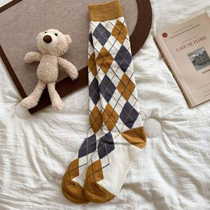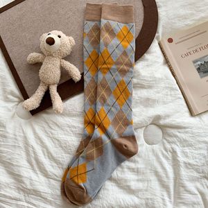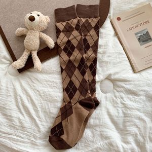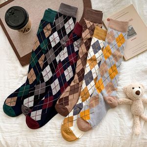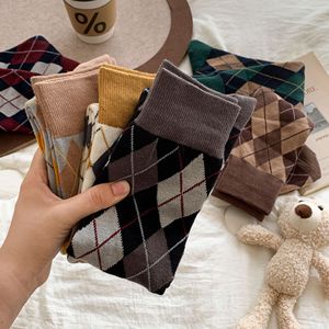 春秋冬季英伦风复古小腿袜子女生学院风咖色菱形格长筒中筒袜