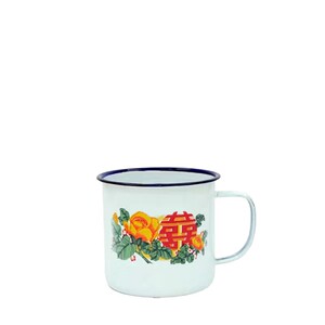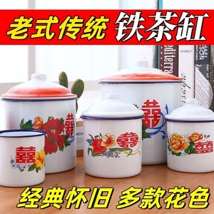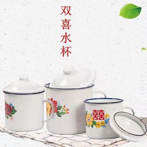 老式搪瓷带盖喜字杯茶缸子泡茶杯婚庆花喜搪瓷杯办公室喝水杯
