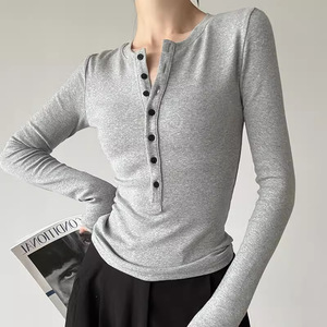 辣妹半开领纽扣设计长袖T恤女春季修身内搭上衣高级感洋气打底衫