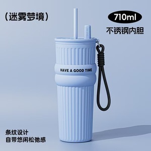 高颜值简约罗马柱条纹保温杯女生办公室咖啡水杯男生随行车载水杯
