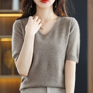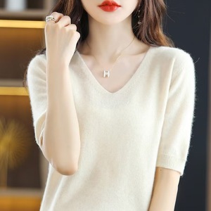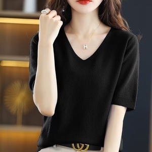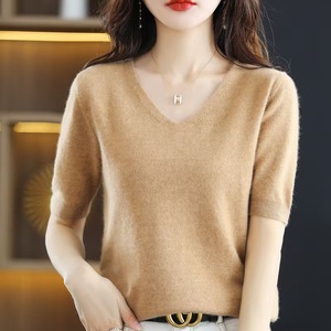 五分袖打底针织衫女V领套头毛衣宽松休闲韩版半袖上衣中袖