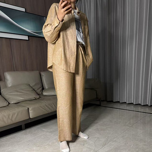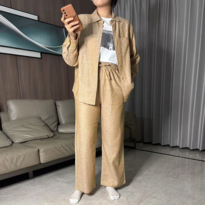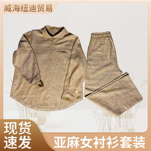 新品 长袖衬衫阔腿长裤套装2025纯色亚麻长裤休闲套装 厂家批发